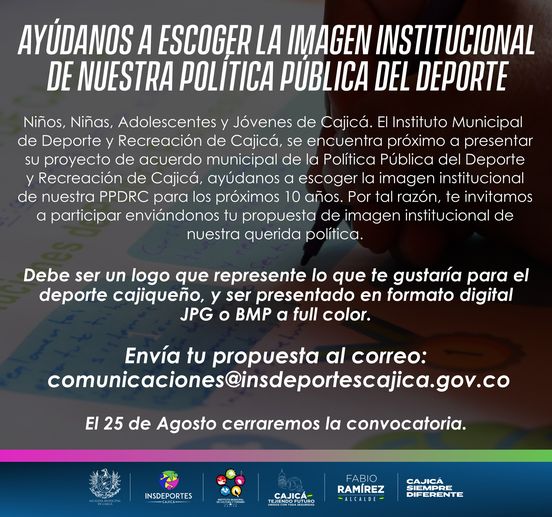 Insdeportes, invita a toda la comunidad a enviar su propuesta para la imagen de la PPDRC para los próximos 10 años. Envíanos tu logo hasta el próximo 25 de agosto al correo: comunicaciones@insdeportesupdate.cajica.gov.co recuerda que este debe representar lo que te gustaría para el deporte Cajiqueño.