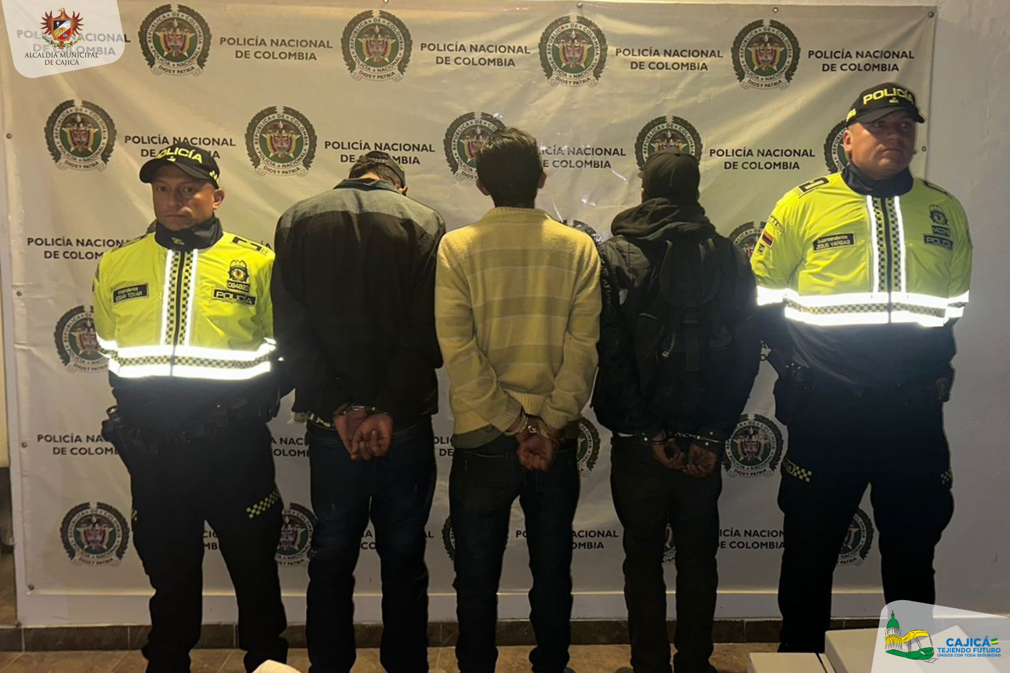 En labores de patrullaje y control, la Fuerza Pública realiza la captura de tres hombres por el delito de hurto a persona con recuperación de mercancía en el sector de Calle séptima con carrera sexta, se hace el debido seguimiento, la víctima interpone la denuncia penal y los capturados son trasladados a la URI de Chía para su respetiva judicialización.