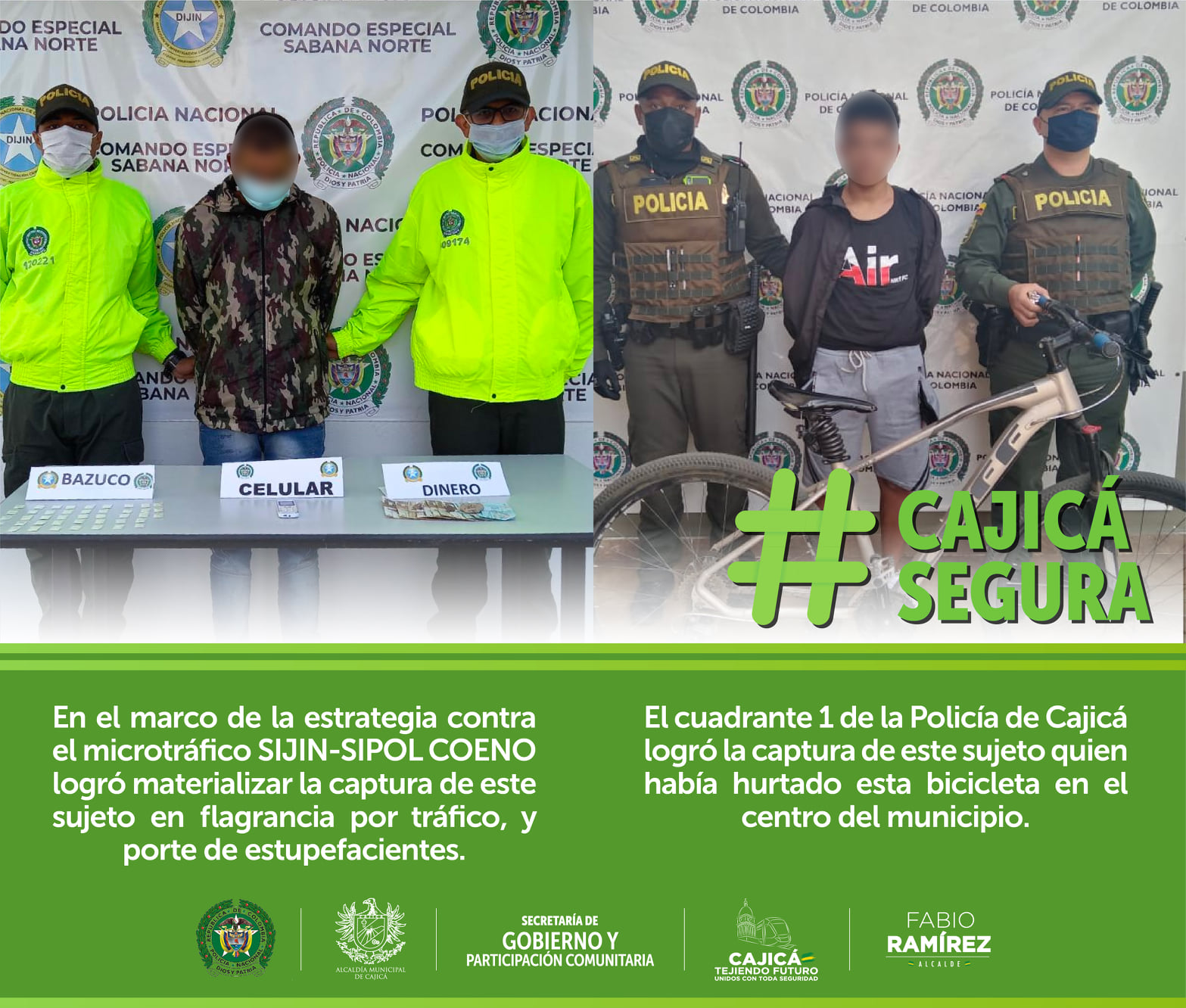#CajicáSegura ll Desde la Alcaldía de Cajicá, en cabeza del arquitecto @Fabio Ramírez y bajo el liderazgo de la Secretaría de Gobierno se han adelantado diferentes operativos que han permitido la captura de sujetos que se encontraban realizando actividades ilícitas.