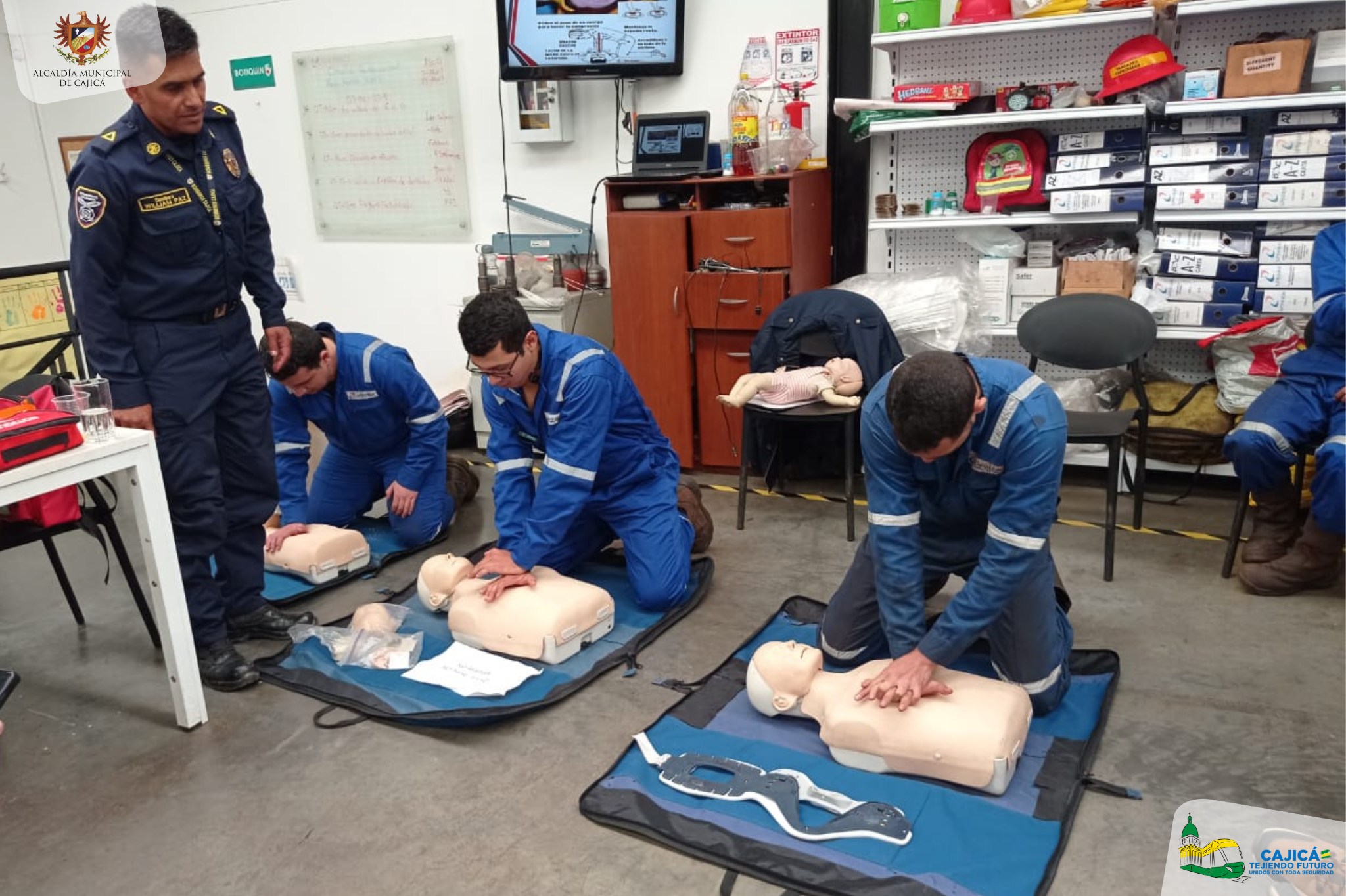 #Capacitación ll La Dirección de Gestión del Riesgo junto con el Cuerpo Oficial de Bomberos del municipio de Cajicá, teniendo en cuenta el plan de gestión del riesgo de desastres y la estrategia municipal para la respuesta de emergencias, realizaron una capacitación al personal de la empresa Spinner S.A.S, donde se trabajaron temas de primeros auxilios, primer respondiente, primeros auxilios psicológicos, manejo de extintores, evacuación entre otros aspectos; con el objetivo de fortalecer las habilidades de cada una de las personas, para que así mismo tengan conocimiento de como actuar al momento de una emergencia.