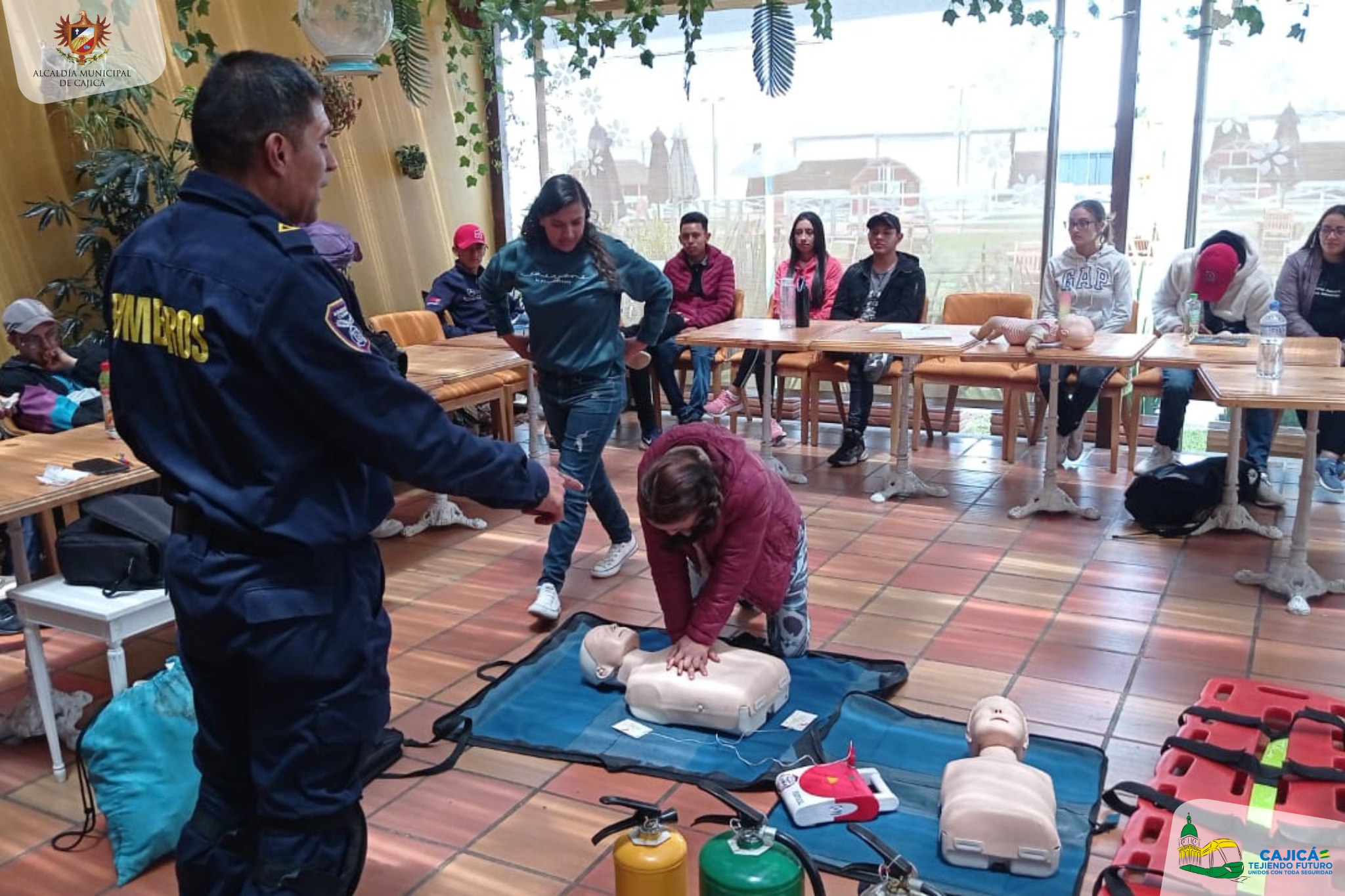 #Capacitación ll La Dirección de Gestión del Riesgo junto con el Cuerpo Oficial de Bomberos del municipio de Cajicá, teniendo en cuenta el plan de gestión del riesgo de desastres y la estrategia municipal para la respuesta de emergencias, realizaron una capacitación al personal del restaurante Rancho MX, donde se trabajaron temas acerca del uso de extintores, primer respondiente, RCP y primeros auxilios psicológicos, con el fin de fortalecer las habilidades de cada una de las personas y así mismo sepan cómo actuar al momento de una emergencia.