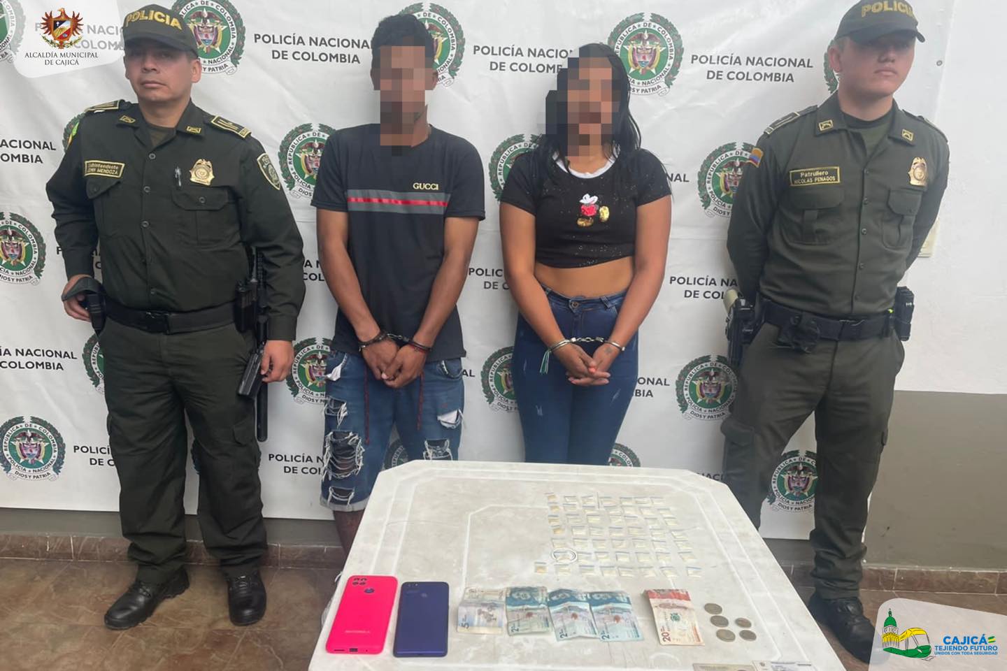 🚨 #CajicáSegura ll Siguiendo las instrucciones del alcalde Fabio Ramírez, la Policía Nacional realiza la captura de una mujer y un hombre en el sector La Estación, donde se logra la incautación de 50 bolsas ziploc con sustancia pulverizada similar al bazuco y dinero, estas dos personas son capturadas por el delito de tráfico, fabricación y porte de estupefacientes.