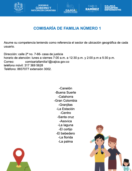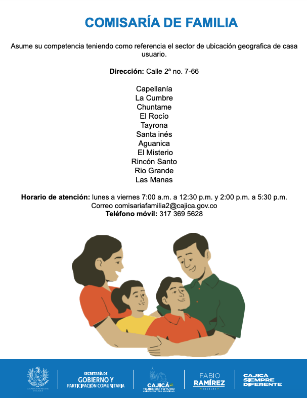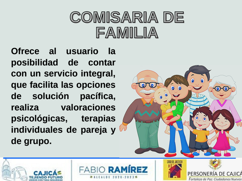 Las Comisarías de Familia fueron creadas por el Decreto 2737 de 1989, forman parte de la Rama Ejecutiva del Poder Público del municipio, tienen funciones y competencias de autoridad administrativa con funciones judiciales y de orden policivo, ofreciendo al usuario la posibilidad de contar con un servicio integral, que facilita las opciones de solución pacífica y fortalece los principios de equidad. En este sentido, realiza valoraciones psicológicas, terapias individuales de pareja y de grupo, realiza seguimiento a los casos atendidos en la Casa de Justicia y está regulada por el código de infancia y adolescencia la ley 1098 de 2006.