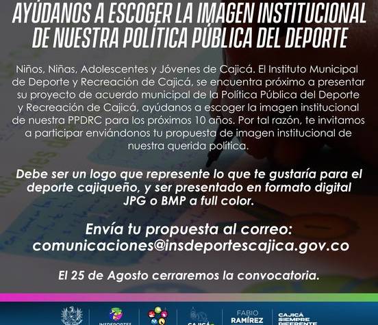 Insdeportes, invita a toda la comunidad a enviar su propuesta para la imagen de la PPDRC para los próximos 10 años. Envíanos tu logo hasta el próximo 25 de agosto al correo: comunicaciones@insdeportesupdate.cajica.gov.co recuerda que este debe representar lo que te gustaría para el deporte Cajiqueño. Participa y obtén un maravilloso obsequio.