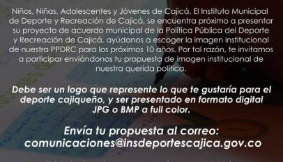 Insdeportes, invita a toda la comunidad a enviar su propuesta para la imagen de la PPDRC para los próximos 10 años. Envíanos tu logo hasta el próximo 25 de agosto al correo: comunicaciones@insdeportesupdate.cajica.gov.co recuerda que este debe representar lo que te gustaría para el deporte Cajiqueño. Participa y obtén un…