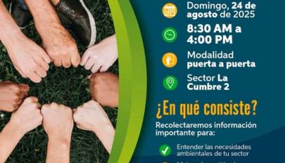 Juntos por el futuro ambiental de La Cumbre Fecha: Domingo, 24 de agostoHora: 8:30 a.m. a 4:00 p.m.Lugar: Sector La Cumbre 2 (visita puerta a puerta) ¿Por qué participar?• Tus respuestas ayudarán a crear mejores políticas ambientales• Identificaremos las necesidades prioritarias de tu sector Actividad en cumplimiento de la meta…