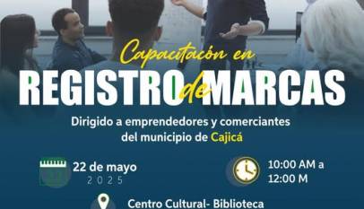 Emprendedores y comerciantes de Cajicá:Participe en la capacitación sobre registro de marcas, un espacio diseñado para fortalecer el conocimiento legal y estratégico en la protección de su marca y negocio. Fecha: 22 de mayo de 2025Hora: 10:00 a. m. a 12:00 m.Lugar: Centro Cultural – Biblioteca (tercer piso) ¡Los esperamos!