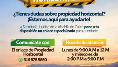 La Secretaría Jurídica ofrece asesoría especializada para resolver inquietudes sobre propiedad horizontal. Comuníquese a través del WhatsApp 316 878 5850 y reciba la orientación que necesita. Horario de atención:• Lunes: 9:00 a.m. a 12:00 m.• Miércoles: 2:00 p.m. a 5:00 p.m. Estamos para ayudarle.