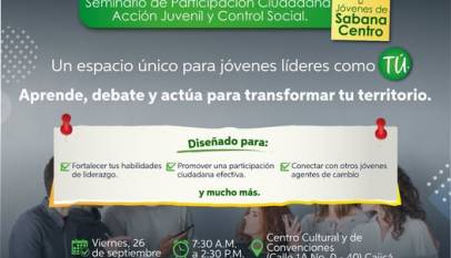 Jóvenes de Sabana Centro, los invitamos a participar en el Seminario de Participación Ciudadana, Acción Juvenil y Control Social, un espacio de formación y liderazgo para fortalecer la participación juvenil en la región. Dirigido a: Ciudadanía en general, miembros del Consejo de Participación Ciudadana y de los Consejos de Juventud.…
