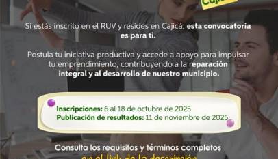 La Administración Municipal invita a la población víctima del conflicto armado en Cajicá a postular sus iniciativas productivas y acceder al apoyo necesario para impulsar sus emprendimientos, contribuyendo a la reparación integral y al desarrollo del municipio. Inscripciones: del 6 al 18 de octubre de 2025Publicación de resultados: 11 de…