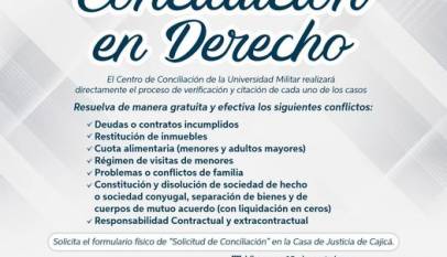 Llega la Jornada de Conciliación en Derecho, una estrategia de la Casa de Justicia y la Universidad Militar Nueva Granada, con el objetivo de ofrecer asesoría y orientación legal a todos los ciudadanos. Viernes, 18 de octubre Casa de Justicia 8:00 AM a 1:00 PM, según agenda y asignación de…
