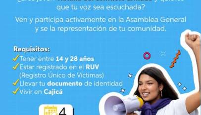 ¡Atención jóvenes de Cajicá!¿Eres víctima del conflicto armado y quieres que tu voz sea escuchada? Este es tu momento. Haz parte del Consejo Municipal de Juventudes.Asiste y participa activamente en la Asamblea General para Jóvenes Víctimas del Conflicto Armado en Cajicá. Inscríbete aquí:https://forms.gle/5a54dHnZdCSuPHz56 Avanzamos en el cumplimiento de la meta…