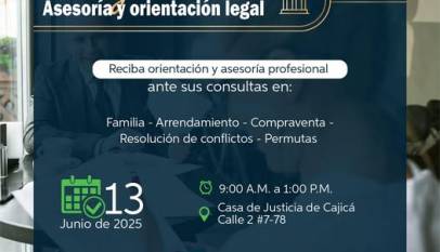 Si tiene dudas legales en temas de familia, arrendamiento, compraventa o resolución de conflictos, lo invitamos a participar en esta jornada gratuita organizada por la Secretaría de Gobierno y Participación Ciudadana y la Casa de Justicia, con el apoyo del Centro de Conciliación y Arbitraje Auxilio Jurídico. Viernes, 13 de…