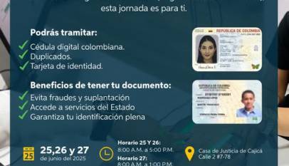 ¿Es víctima del conflicto armado y está registrado en el RUV (Registro Único de Víctimas) en Cajicá? Participe en la primera jornada de cedulación especialmente dirigida a usted. Fechas: 25, 26 y 27 de junioHorarios: 25 y 26 de junio: 8:00 a.m. – 5:00 p.m. 27 de junio: 8:00 a.m.…