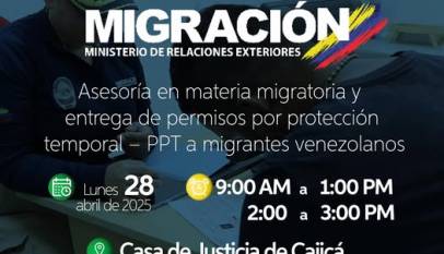 Reciba asesoría y orientación en temas migratorios, incluyendo trámites relacionados con el Permiso por Protección Temporal (PPT). Fecha: Lunes, 28 de abril de 2025Hora: 9:00 a.m. a 1:00 p.m. y 2:00 p.m. a 3:00 p.m.Lugar: Casa de Justicia Actividad enmarcada en la meta 134 del PDM, Cajicá Ideal.