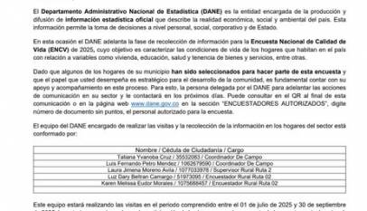 El Departamento Administrativo Nacional de Estadística (DANE) adelanta la fase de recolección de información para la Encuesta Nacional de Calidad de Vida (ENCV) 2025, cuyo objetivo es caracterizar las condiciones de vida de los hogares en el país en aspectos como vivienda, educación, salud, tenencia de bienes y servicios, entre…
