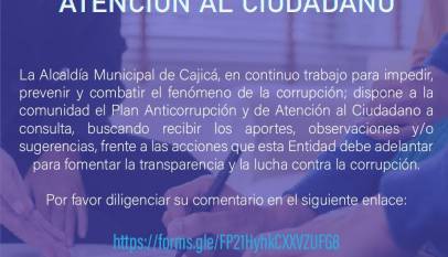 #ParticipaciónCiudadana ll ¡Contamos contigo! Desde la Administración Municipal te invitamos opinar sobre los componentes que conforman el Plan Anticorrupción y de Atención al Ciudadano. Es momento de participar. ¡Tu opinión es muy importante para nosotros! https://forms.gle/kQFp2rGvUfeuoSNZ7 Descarga la matriz del Plan Anticorrupción en el siguiente enlace: Matriz_PAAC