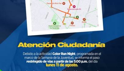El lunes 11 de agosto, a partir de las 5:00 p. m., se realizarán cierres y pasos restringidos en algunas vías del municipio debido a la actividad Color Run Night. Meta 84 del PDM, Cajicá Ideal.Se invita a tomar rutas alternas y programar los desplazamientos con anticipación.