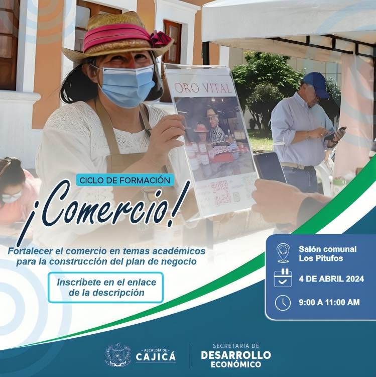 La Secretaría de Desarrollo Económico invita a participar en el ciclo de formación en Comercio que se llevará a cabo el jueves, 4 de abril de 2024 a partir de las 9:00 a.m. hasta las 11:00 a.m. en el Salón Comunal Los Pitufos, esto con el fin de fortalecer a los comerciantes cajiqueños en temas académicos para la elaboración de su plan de negocio.