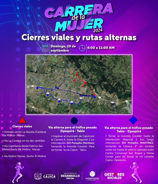 Este domingo 29 de septiembre se realizarán cierres viales con motivo de la Carrera de la Mujer 2024. Recuerde programar sus salidas con anticipación y seguir las rutas alternas para llegar a sus destinos.
