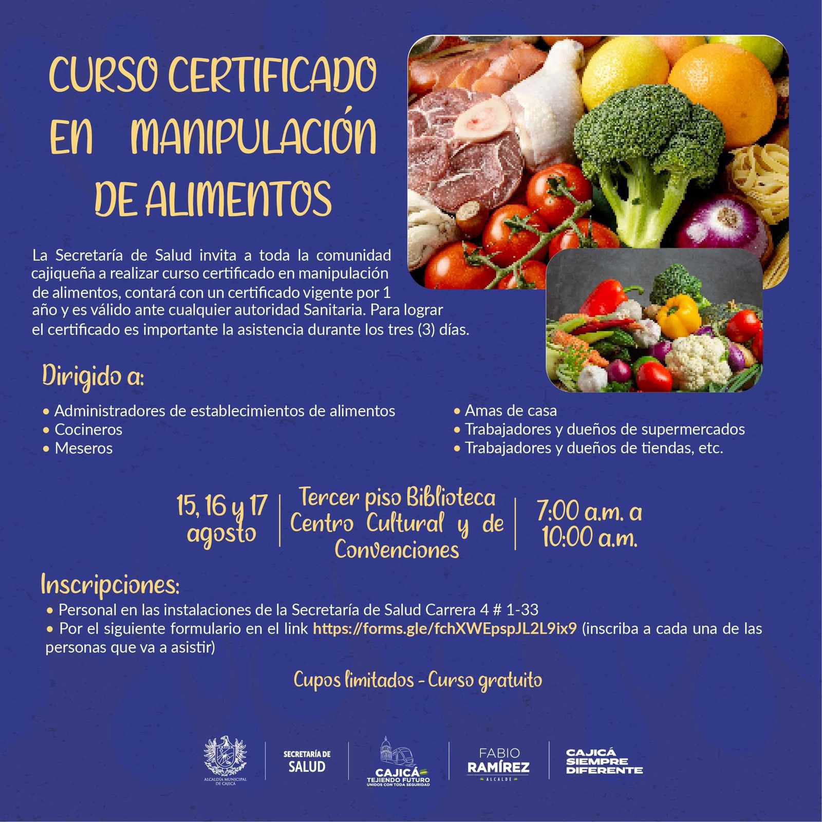 🔵 #Capacitación ||La Secretaría de Salud de Cajicá lo invita a participar del Curso de Manipulación de Alimentos totalmente gratuito, que se realizará los días 15, 16 y 17 de agosto de 2023 de 7am a 10am.