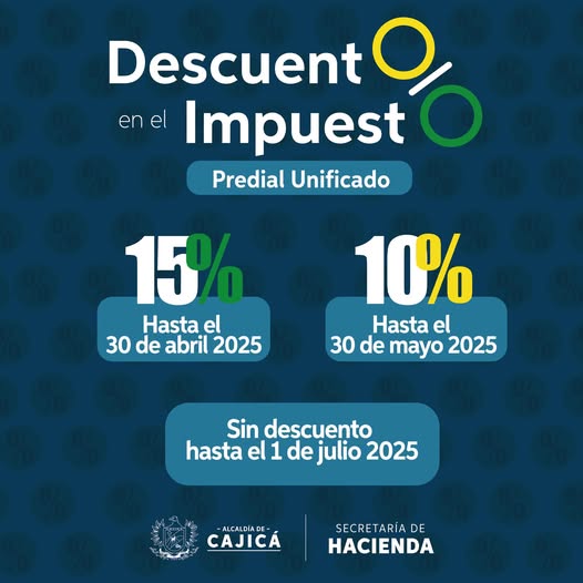 Desde el lunes 10 de febrero, puede acceder a su recibo en la ventanilla de la Secretaría de Hacienda o en el siguiente enlace: https://update.cajica.gov.co/pago-de-impuestos/. Aproveche los descuentos por pago oportuno.