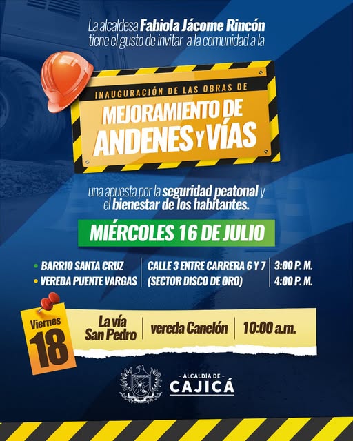 La alcaldesa Fabiola Jácome tiene el gusto de invitar a toda la comunidad a la entrega oficial de las obras de mejoramiento de andenes y vías, una apuesta por la seguridad peatonal y el bienestar de nuestros habitantes.