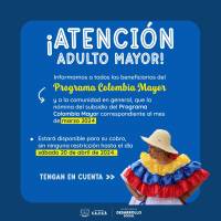 La Secretaría de Desarrollo Social informa a los adultos mayores beneficiarios del Programa Colombia Mayor, que la nómina del subsidio correspondiente al mes de marzo, estará disponible para su cobro hasta el sábado 20 de abril de 2024.