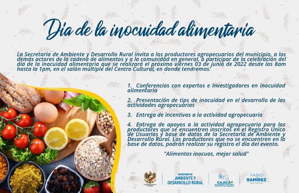#InocuidadAlimentaria || La Secretaría de Ambiente y Desarrollo Rural invita a participar de la celebración del día de la inocuidad alimentaria, recordando la importancia para la producción, almacenamiento, distribución y preparación de alimentos para asegurar que una vez ingeridos, no representen un riesgo para la salud. Viernes 3 de junio 8:00 a.m. Centro Cultural y de Convenciones (salón múltiple). Los esperamos.