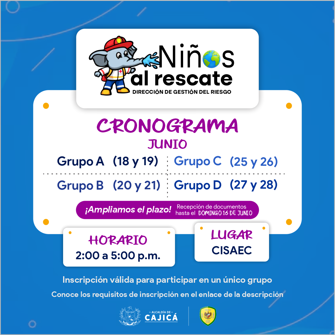 El programa Niños al Rescate dirigido por el Cuerpo Oficial de Bomberos y la Dirección de Gestión del Riesgo de la Alcaldía Municipal de Cajicá invita a la comunidad a inscribir a sus hijos en esta iniciativa destinada a la participación y formación en hábitos de autoprotección y prevención de emergencias.