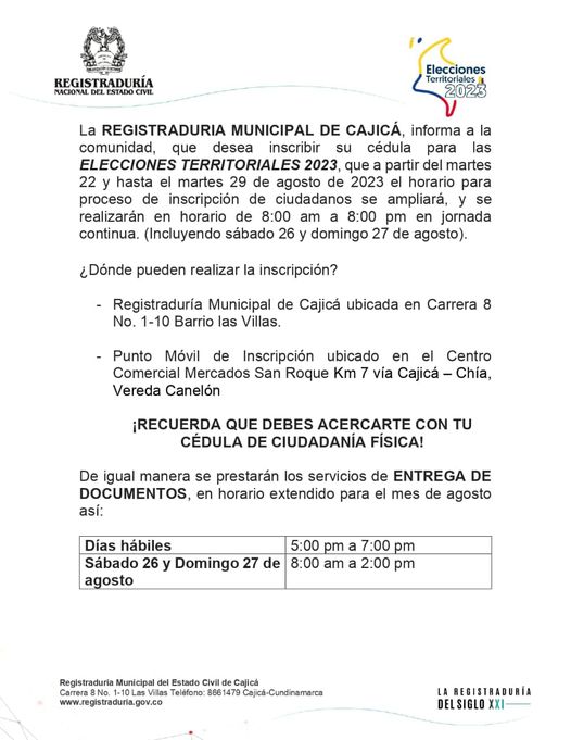 -Registraduría Municipal de Cajicá ubicada en Carrera 8 No. 1-10 Barrio las Villas.