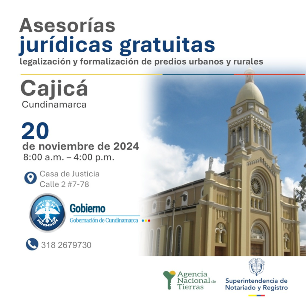 La SUPERINTENDENCIA DE NOTARIADO Y REGISTRO invita a toda la comunidad Cajiqueña para que se acerque a las instalaciones de la Alcaldía municipal a la jornada de asesoría prevista para el día 20 de noviembre de la presente anualidad en el horario de 08:00 a.m. a 4:00 p.m. en temas de registro en general (sucesiones, procesos de pertenencia, entre otros)