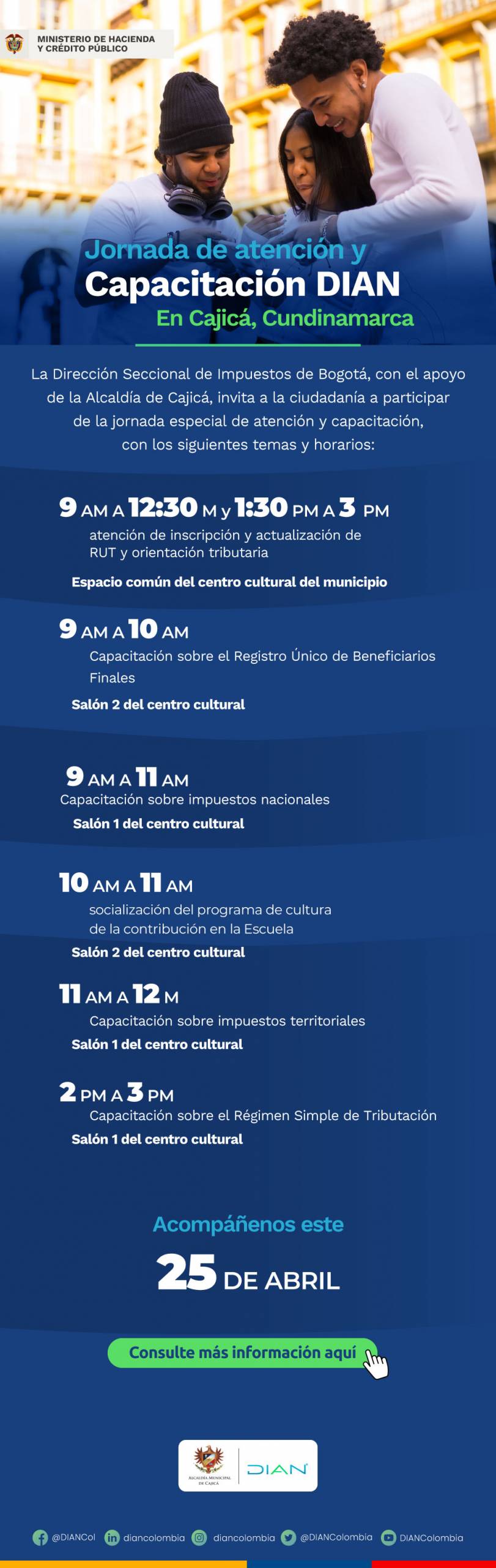 La Secretaría de Desarrollo Económico de Cajicá, en alianza con la Dirección de Impuestos y Aduanas Nacionales DIAN, te invitan a participar de la jornada de atención y capacitación.