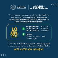 La Secretaría de Gobierno y Participación Ciudadana, en articulación con la Cámara de Comercio de Bogotá (CCB), invita a la comunidad cajiqueña a participar en la Jornada de Conciliación en Equidad, una actividad gratuita orientada a resolver conflictos de manera pacífica.