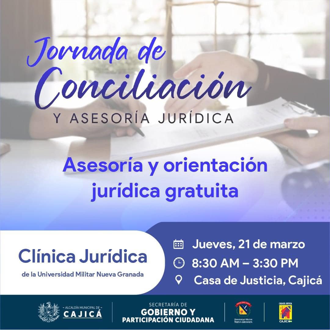 La Secretaría de Gobierno y Participación Ciudadana junto a la Clínica Jurídica de la Universidad Militar Nueva Granada, invita a la Jornada de Conciliación y Asesoría Jurídica que se realizará el jueves, 21 de marzo de 2024, a partir de las 8:30 a.m. en la Casa de la Justicia.