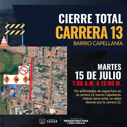 La Secretaría de Infraestructura y Obras Públicas informa a la comunidad que se llevará a cabo mantenimiento vial en la carrera 13, en el barrio Capellanía.