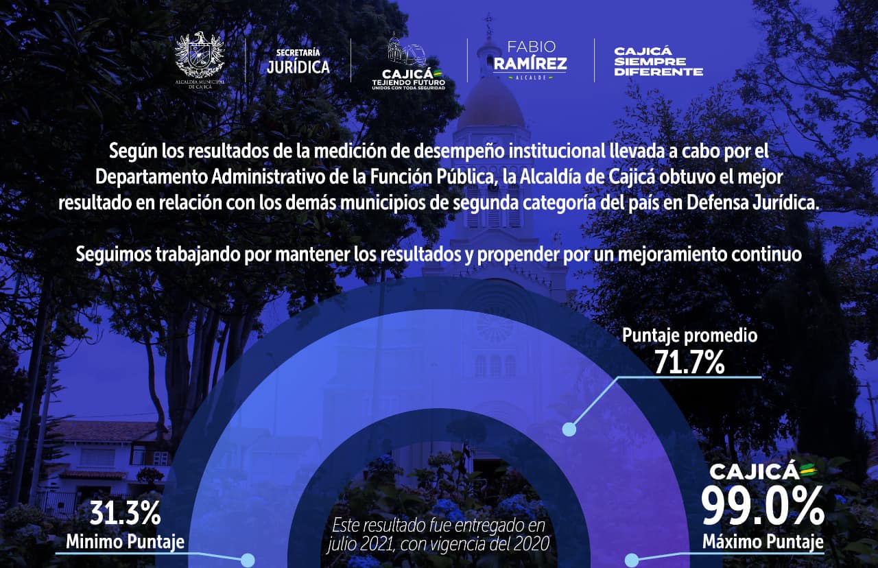 🥇#DefensaJurídica ll De acuerdo a las últimas estadísticas emitidas por el Departamento Administrativo de la Función Pública, la Alcaldía sigue creciendo en desempeño institucional durante la vigencia 2020. Donde Cajicá obtuvo el mejor resultado en relación con los demás municipios de segunda categoría del país en Defensa Jurídica.