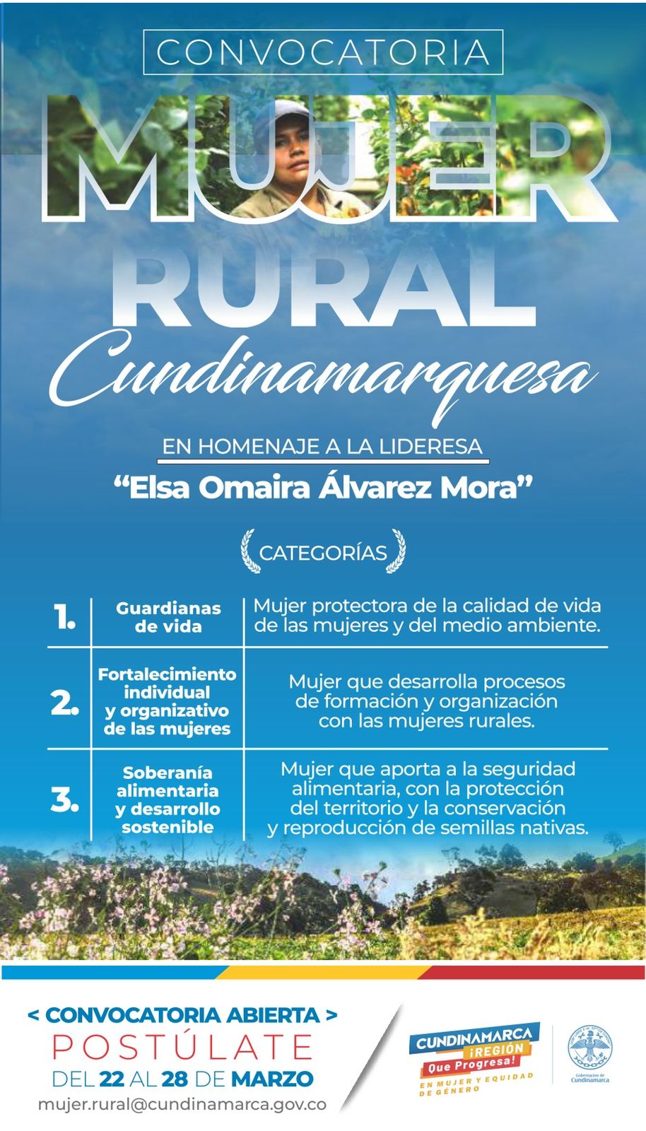 Con el fin de reconocer el papel fundamental que desempeñan las mujeres rurales en el desarrollo sostenible, la producción y el aseguramiento de alimentos en los 116 municipios de Cundinamarca; siendo el soporte de la economía familiar, proporcionando alimentos y cuidados a sus hijos y familiares, la Secretaría de la Mujer y Equidad de Género de la Gobernación de Cundinamarca invita a las mujeres rurales a postularse en la convocatoria “Reconocimiento a la Mujer Rural Cundinamarquesa” en homenaje a la lideresa Elsa Omaira Álvarez Mora.