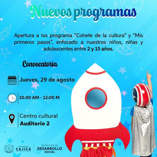 La Secretaría de Desarrollo Social a través de la Dirección de Infancia y Juventud, invita a toda la comunidad a la presentación de los nuevos programas de la Ludoteca “Cohete de la cultura” y “Mis primeros pasos”, enfocado a niños, niñas y adolescentes entre 2 y 15 años.