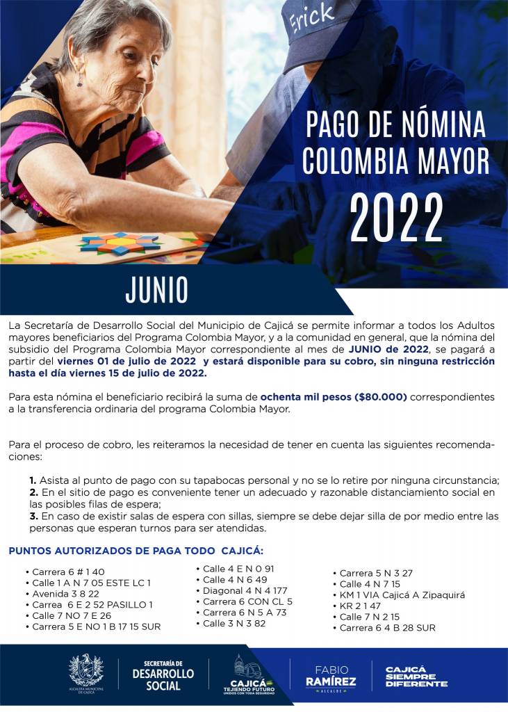 #Importante ll La Secretaría de Desarrollo Social de Cajicá se permite informar a todos los Adultos mayores beneficiarios del Programa Colombia Mayor y a la comunidad en general, que la nómina del subsidio del Programa Colombia Mayor correspondiente al mes de JUNIO de 2022, se pagará a partir del día de hoy viernes 01 de julio y estará disponible para su cobro, sin ninguna restricción hasta el día viernes 15 de julio de 2022.