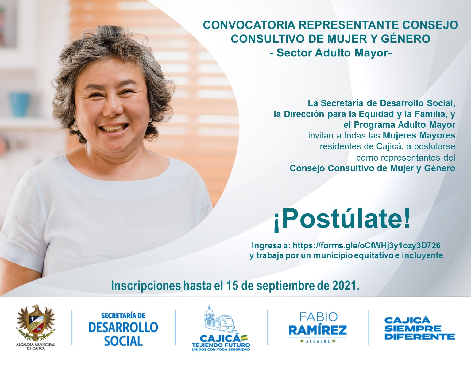 La Secretaría de Desarrollo Social, la Dirección para la Equidad y la Familia, y el Programa Adulto Mayor invitan a todas las Mujeres Mayores residentes de Cajicá, a postularse como representantes del Consejo Consultivo de Mujer y Género.