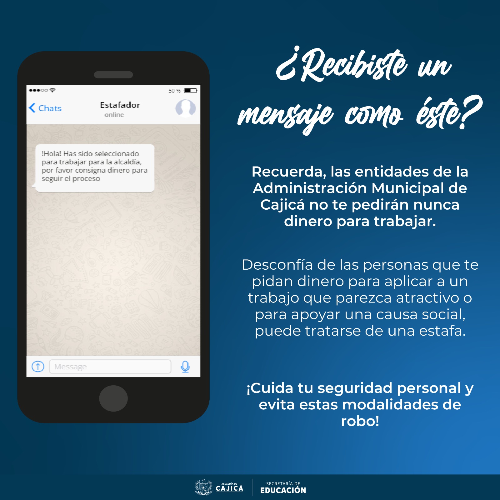 Estas ofertas son fraudulentas y no tienen ninguna relación con la Administración Municipal ni con procesos de selección legítimos. Pedimos a todos estar alerta y no realizar ningún pago o consignación.