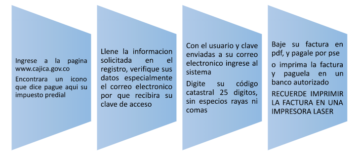 Otra forma para su pago debe ingresar a la Página de la Alcaldía www.update.cajica.gov.co, en el botón PSE, pago de impuesto predial, registrándose y digitando el código catastral.