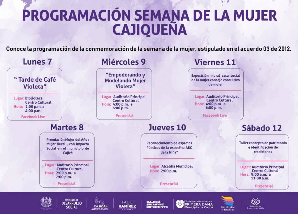 El alcalde Fabio Ramírez, la Gestora Social, Gloria Martínez y la Secretaría de Desarrollo Social, te invitan a agendarte en las diferentes actividades programadas para la Conmemoración de la Semana de la Mujer a partir del lunes 7 de marzo al sábado 12 de marzo.
