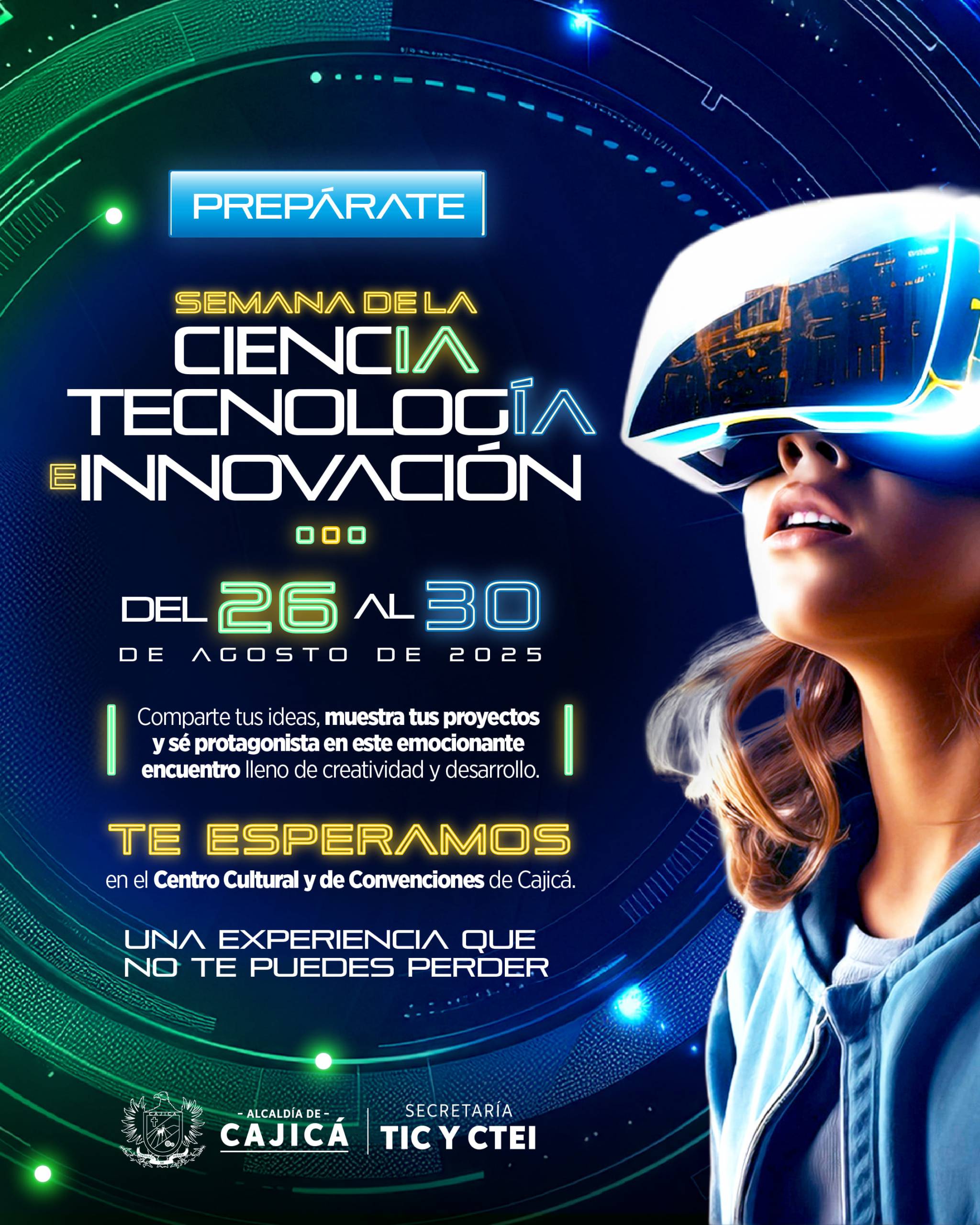 La Secretaría de TIC y CTeI de Cajicá se enorgullece en anunciar la Semana de la Ciencia, Tecnología e Innovación 2025, un evento sin precedentes que se llevará a cabo del 26 al 30 de agosto en el Centro Cultural y de Convenciones.