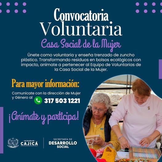 La Casa Social de la Mujer, en alianza con la CAR, busca una voluntaria con conocimientos en trenzado de zuncho plástico para liderar el taller de creación de bolsos ecológicos.